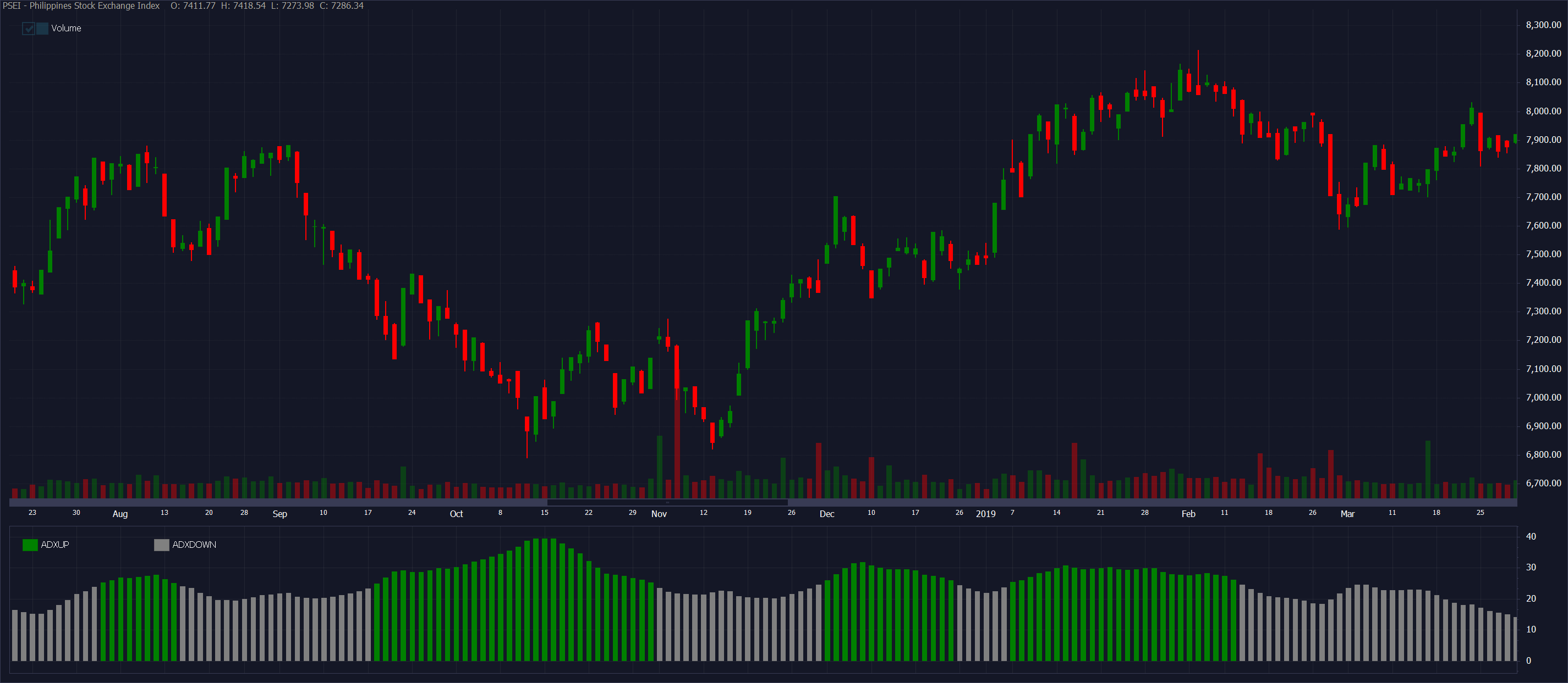 The conventional ADX is plotted as a line graph with a horizontal line at 25 so users can see if ADX is above or below 25. With VAI, we can customize this one step further by changing it into a bar or stackedbar graph and change the colors to green (if ADX>25) and gray (if ADX <25). You can find the script below: