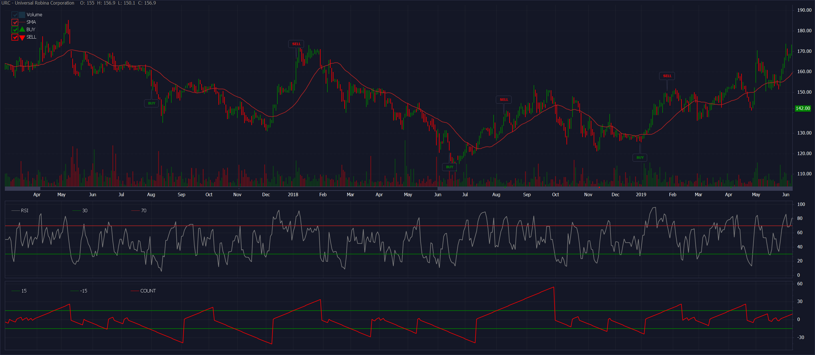 set up=countifs(close>sma, close<sma)